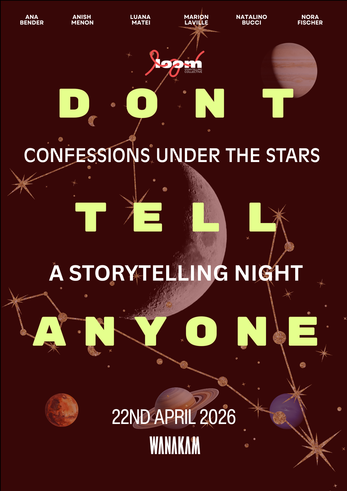 The Storytellers: Nora Fischer, Anish Menon, Natalino Bucci, Luana Matei, Ana Bender and Marion Laville, alumni of the Mezrab Storytelling School, performers across the Netherlands, Amsterdam Fringe and The Spirit Amsterdam, gather in Oost to confess.
